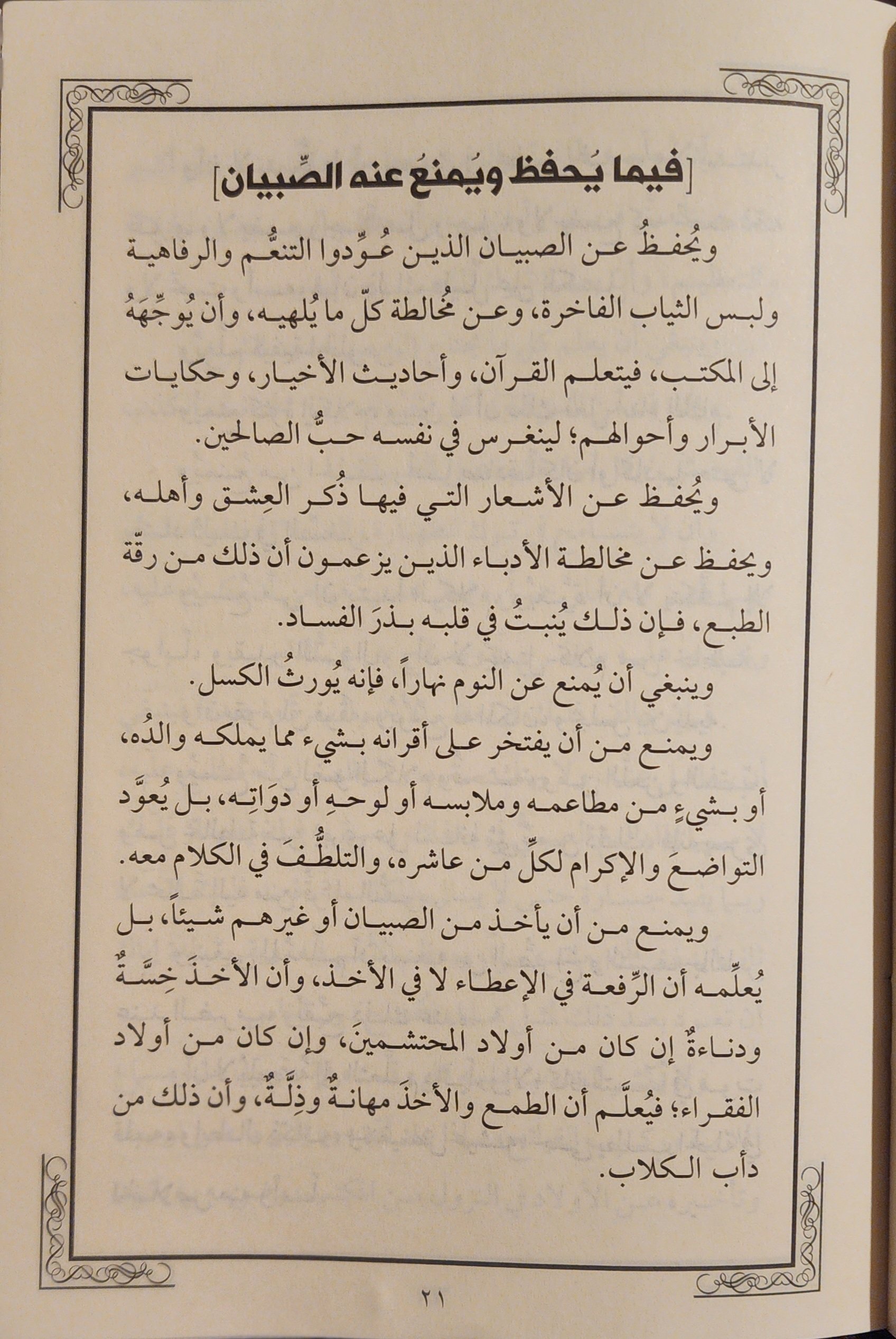 This is an important and beneficial writing needed by parents and every educator to protect their children. It emphasizes the importance of disciplining, guiding, and teaching them good morals and actions, instilling in them virtues that will benefit them both in this life and the hereafter. The upbringing of children, both boys and girls, is one of the most crucial and essential matters. If they are accustomed to goodness, they will grow up with it and find happiness in this life and the hereafter, sharing the reward with their parents and every teacher and educator. However, if they are accustomed to evil and neglected, they will perish and suffer, and the burden will fall on all of them. May Allah guide us all to his pleasure! Aameen.